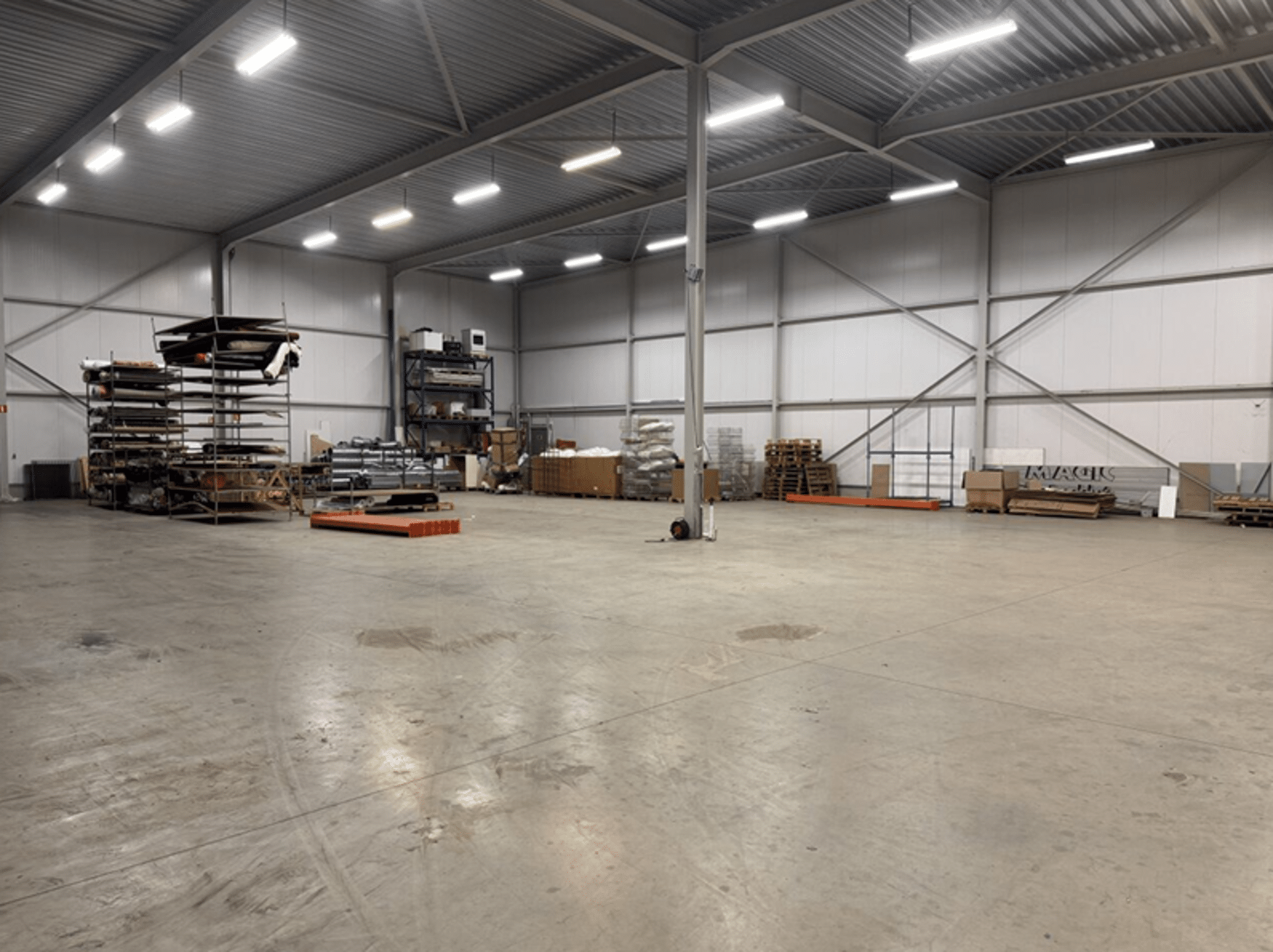 De magazijnruimten van 3.361m² bestaan uit een magazijn van ca. 2.734m² en een werkplaats/atelier van ca. 627m².