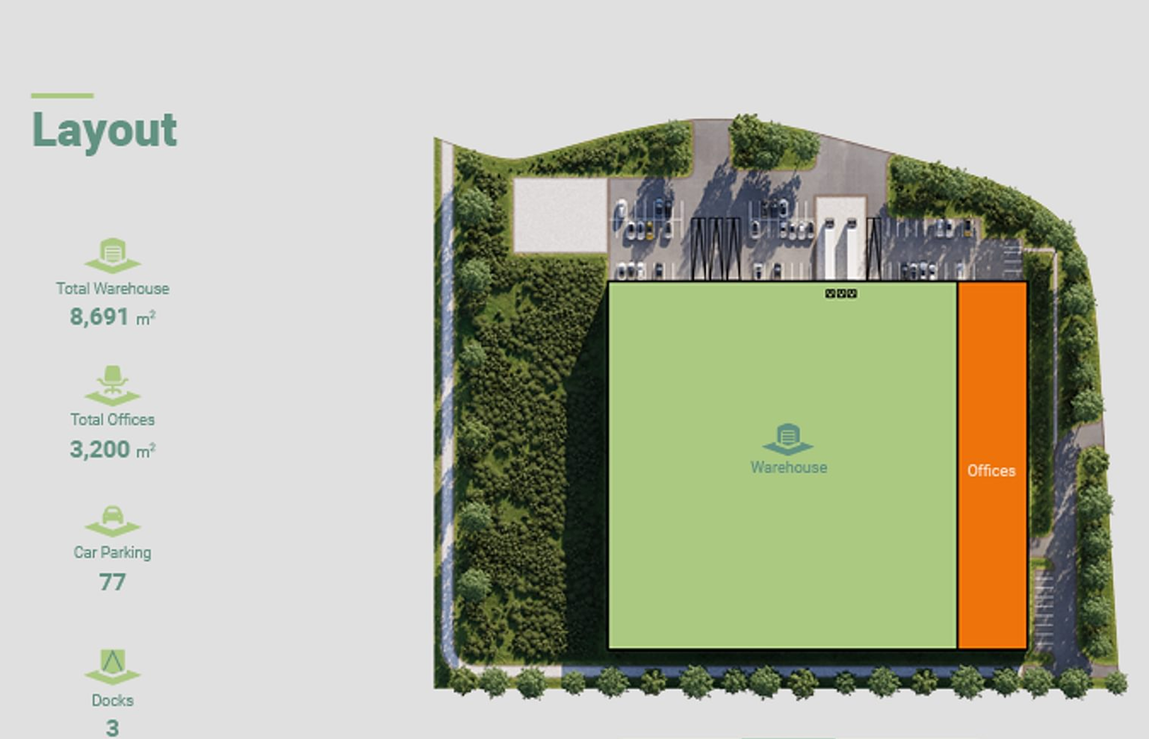 De site omvat ca. 8.691 m² magazijnruimte en ca. 3.200 m² kantoorruimte, verdeeld over het gelijkvloers en de eerste verdieping. De kantoren zijn recent vernieuwd en uitgerust met warmtepompen, terwijl het magazijn beschikt over gasverwarming. Daarnaast zijn er 77 parkeerplaatsen voorzien en is er de mogelijkheid om tot ca. 4.400 m² buitenruimte te creëren voor extra opslag of parking.